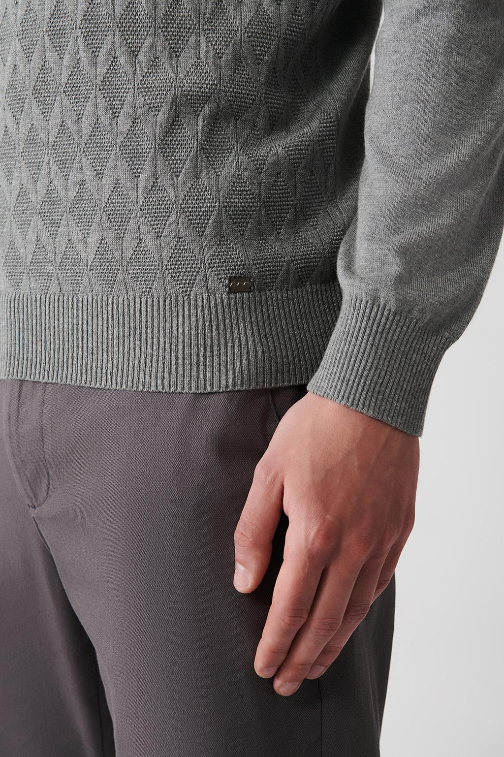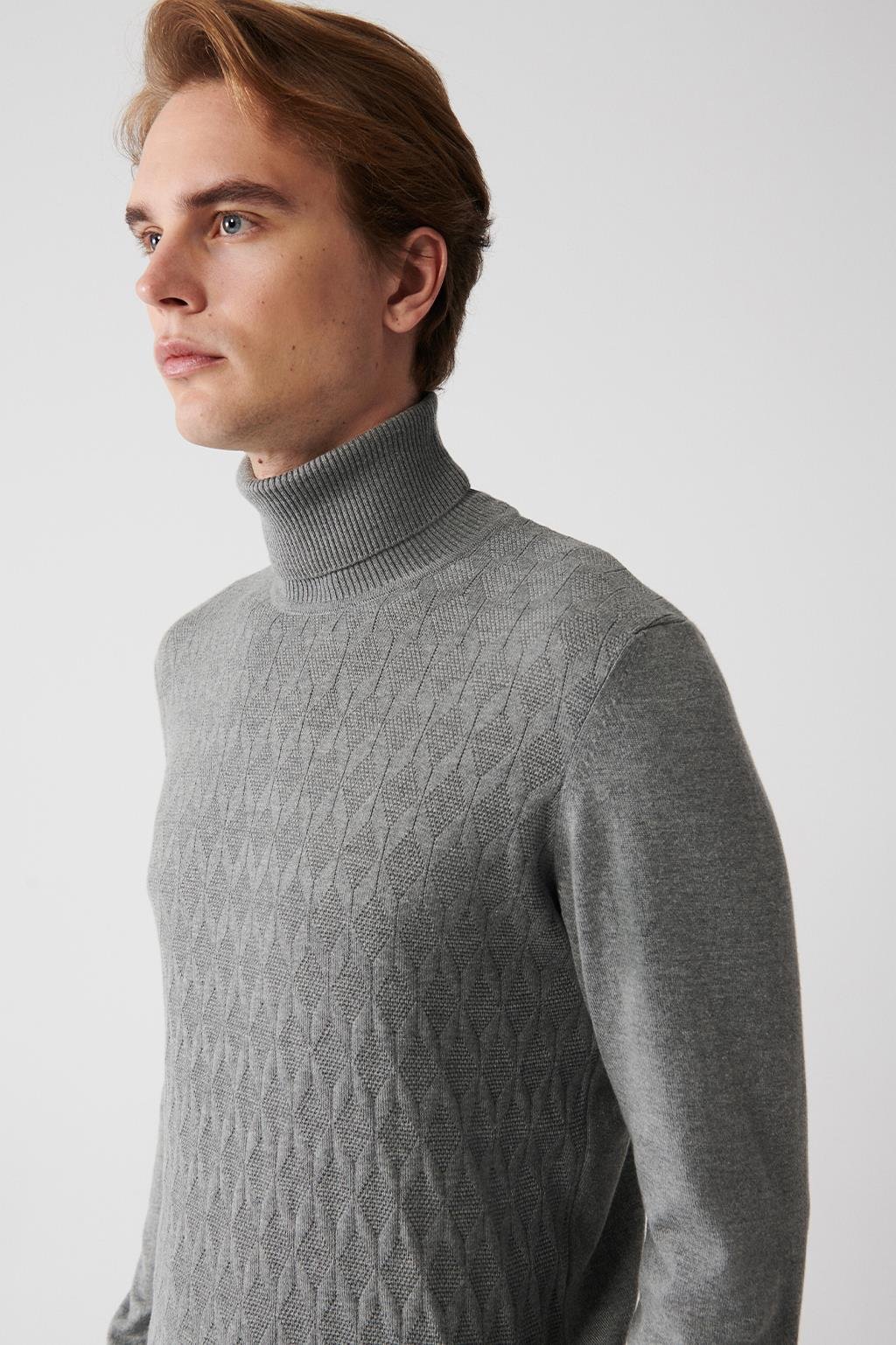 Gri Balıkçı Yaka Pamuklu Desenli Triko Kazak